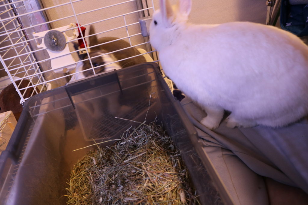 パパがチモシーボックス開けると、ころは膝に上ってチモシーつまみ食いします。